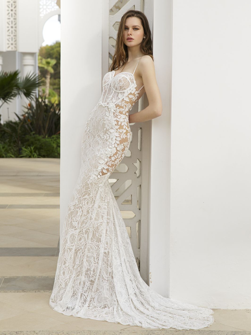 It’s all in the daring details. Showcase all your gorgeous curves with the bold illusion lace side cut-outs, complemented by the sweet corset boning on the bodice. The dainty spaghetti straps, bow detailing, and illusion back completes this striking gown...